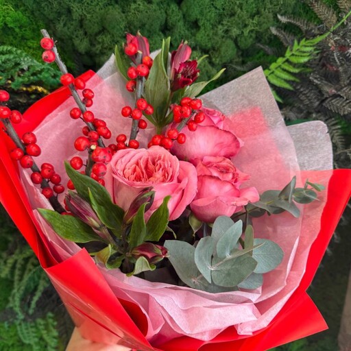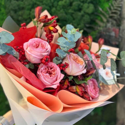 Сборный букет в ярких оттенках с пионовидными розами, илексом, амариллисом , альстромериями,