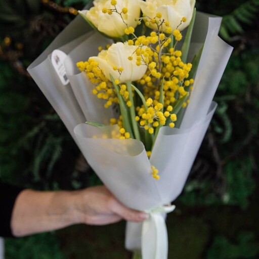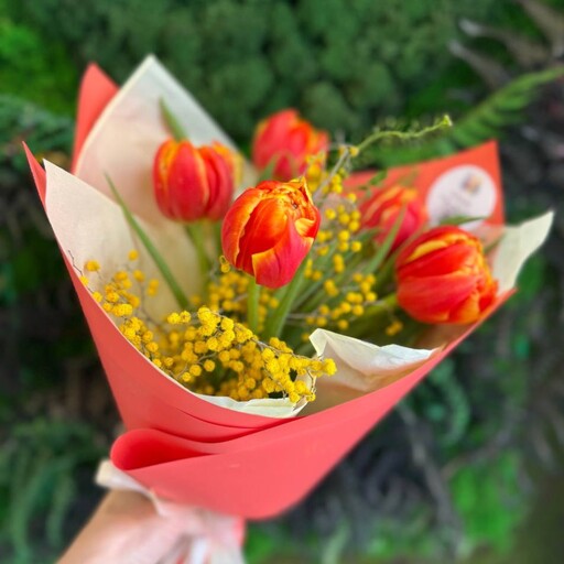 Букет с пионовидными тюльпанами сорта Авангард и мимозой