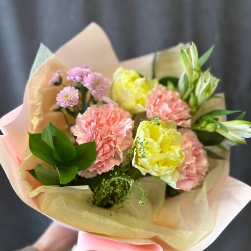 Сборный букет в весенних оттенках с пионовидными тюльпанами