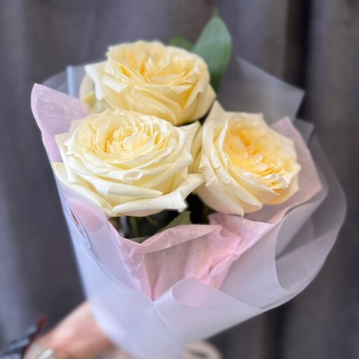 Монобукет из 3х пионовидных кремовых роз в оформлении
