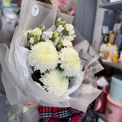 Сборный букет с одноголовыми хризантемами пионовидными розами сорта Плайа бланка 🤍