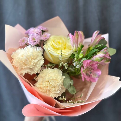 Сборный букет с розой, кустовыми хризантемами, альстромериями, диантусами